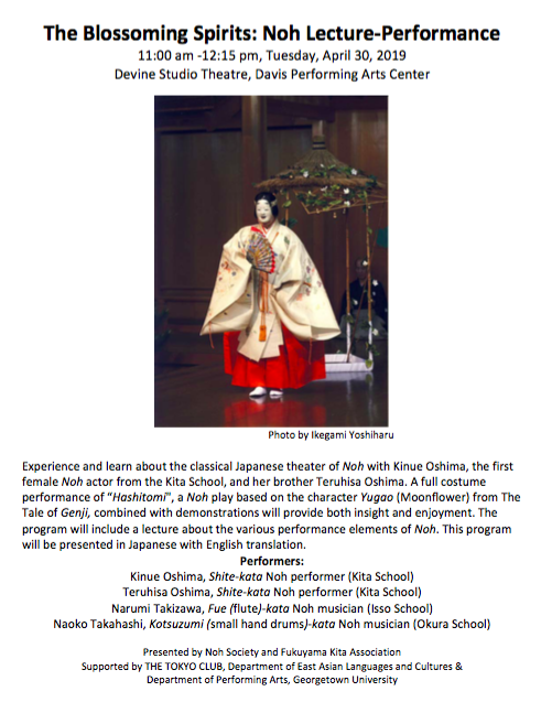 In cooperation with Georgetown University and the Japan Information & Culture Center, Embassy of Japan, Noh Society will be able to present a lecture - performance of Noh, the Blossoming Spirits in Washington DC.